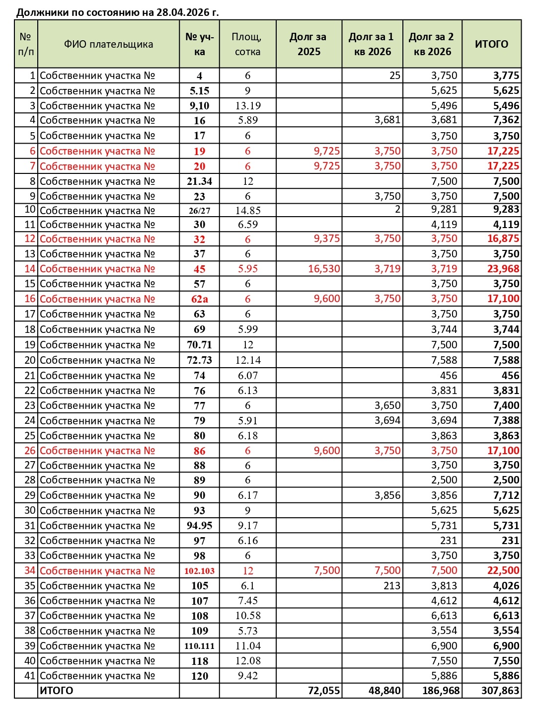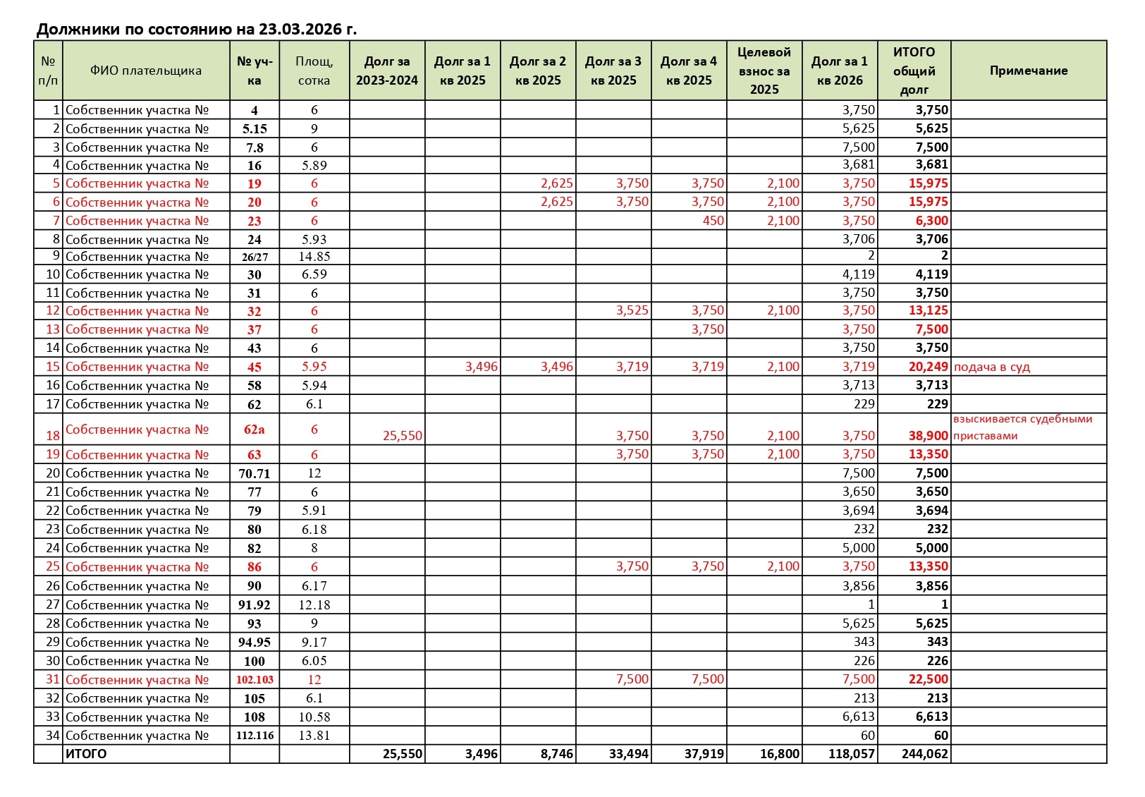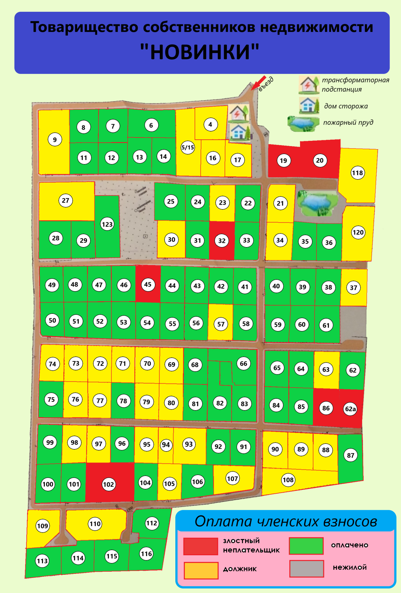 По состоянию на 23.03.2026 г. в Товариществе имеются должники по уплате членских и целевых взносов (на карте должников обозначены желтым цветом), а также злостные неплательщики взносов, которые регулярно оплачивают с большим опозданием или не платят совсем (на карте должников обозначены красным цветом). Таблица с суммами ниже.