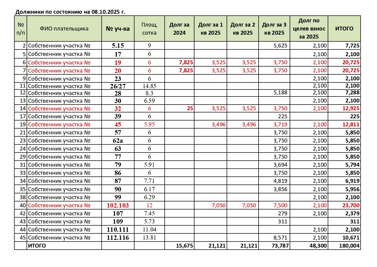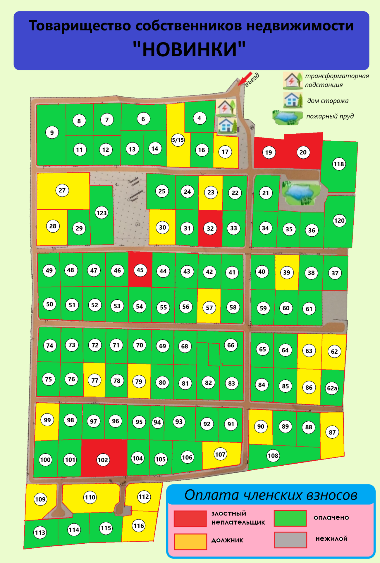 По состоянию на 08.10.2025 г. в Товариществе имеются должники по уплате членских и целевых взносов (на карте должников обозначены желтым цветом), а также злостные неплательщики взносов, которые регулярно оплачивают с большим опозданием или не платят совсем (на карте должников обозначены красным цветом). Таблица с суммами ниже.